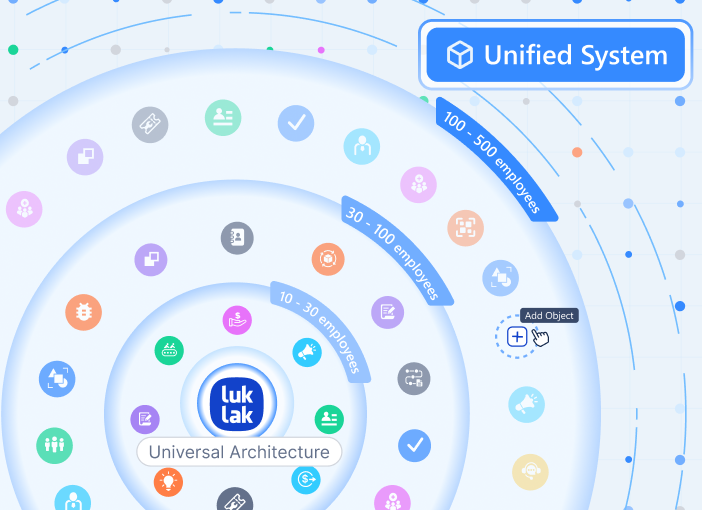 Luklak is unified by architecture. Everything is built from the same Universal Object foundation. Your CRM, projects, and custom functions share one data model. They don’t need integration because they’re already one system.