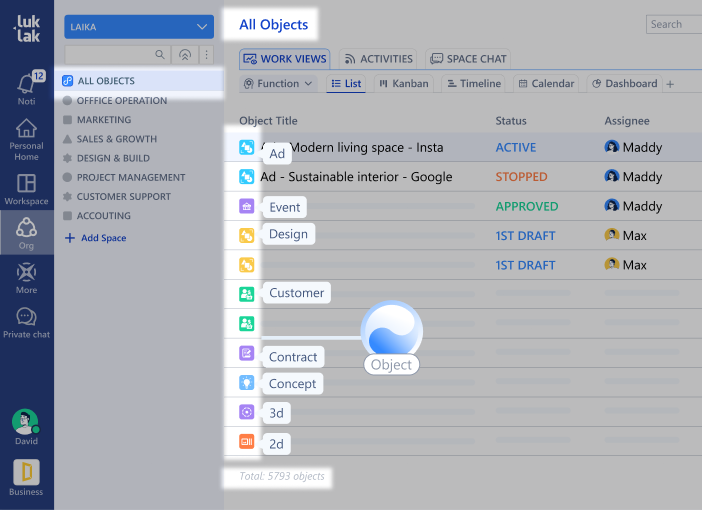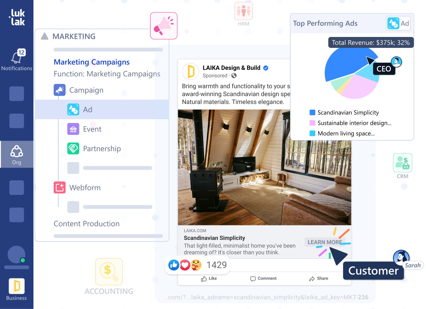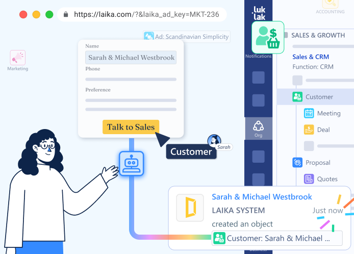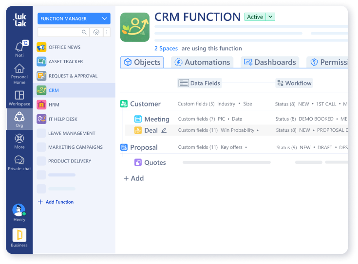 Because dedicated tools create silos; Luklak functions create systems. When you buy a standalone CRM, it sits isolated from your Project Management and Finance tools, requiring expensive integrations to connect them. When you design a CRM in Luklak, it is born connected to every other function in your company. A “Won Deal” natively triggers a “Project” because they share the same DNA, not because you paid for a connector.