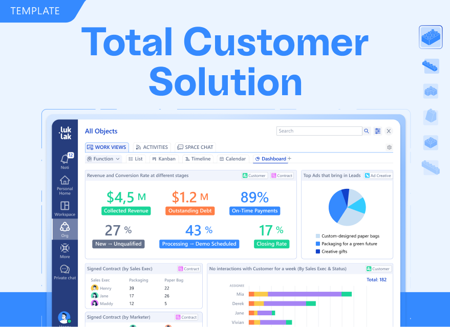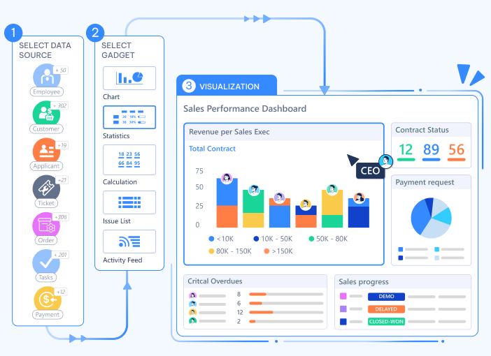 Configure a Kanban Board for active deal management and a Calendar View for field schedules. Simultaneously, build a Manager Dashboard with real-time charts to track “Revenue vs. Targets.” Whether doing the work or measuring it, you design the interface.