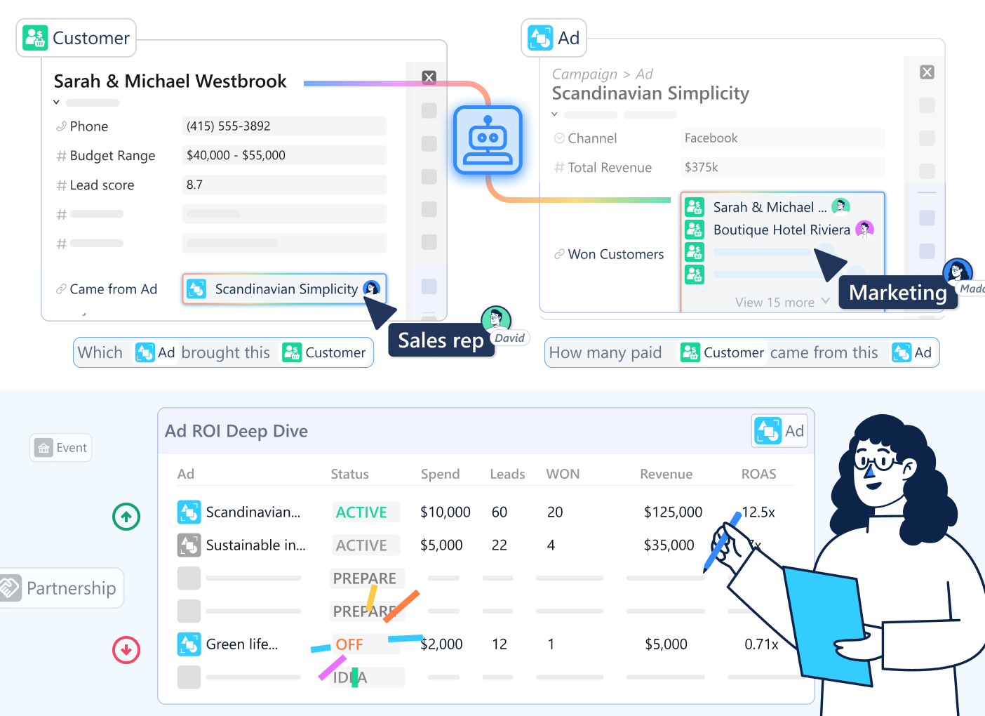 ROI Feedback Loop: As deals close in Sales, the revenue data flows back to the original Marketing Ad object, automatically updating the campaign’s “Realized ROI” in real-time.