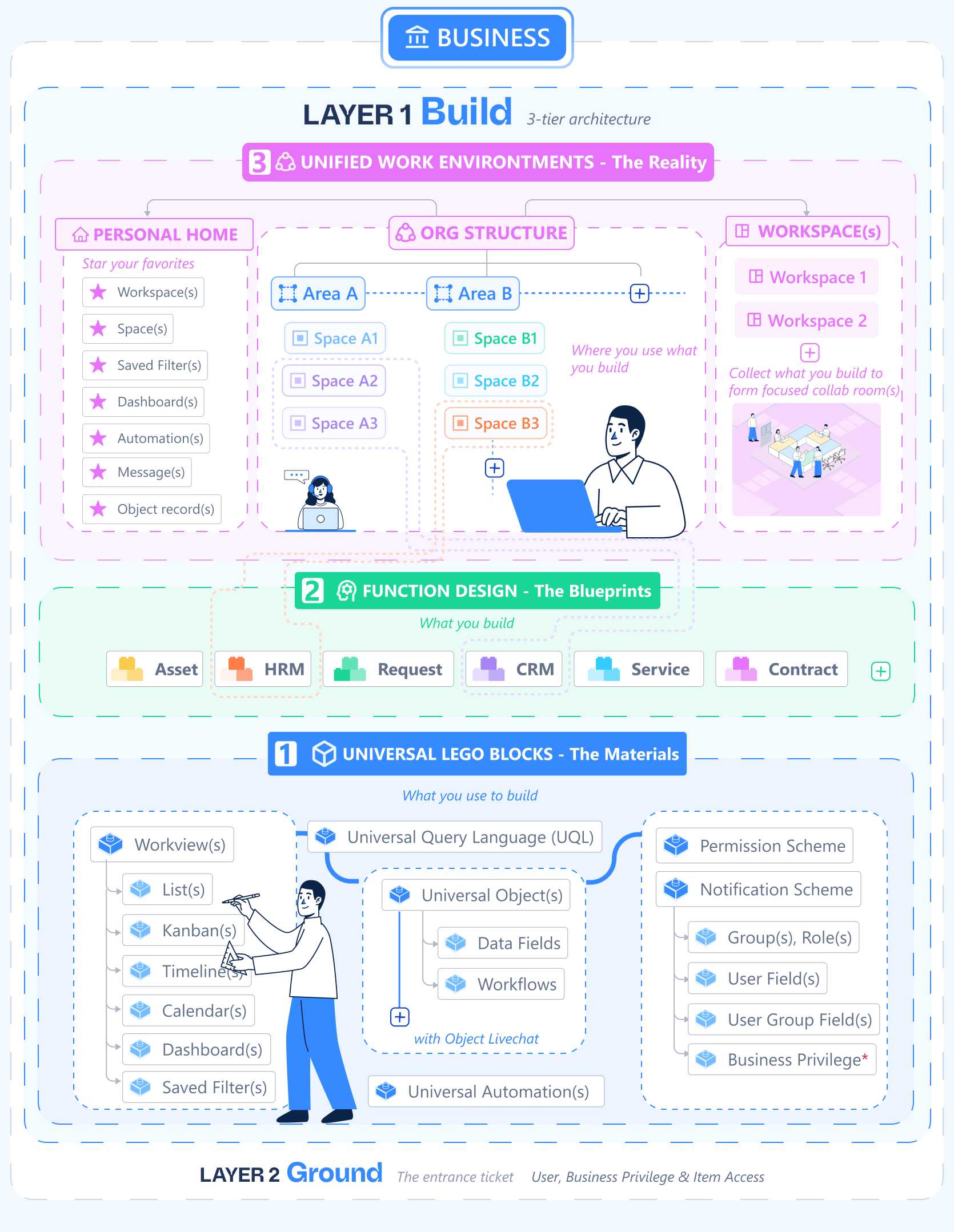 The Build Layer is your unified construction toolkit. It is a three-tiered architectural process designed for NoCode and LowCode users to define, design, and deploy operational logic across the entire business.