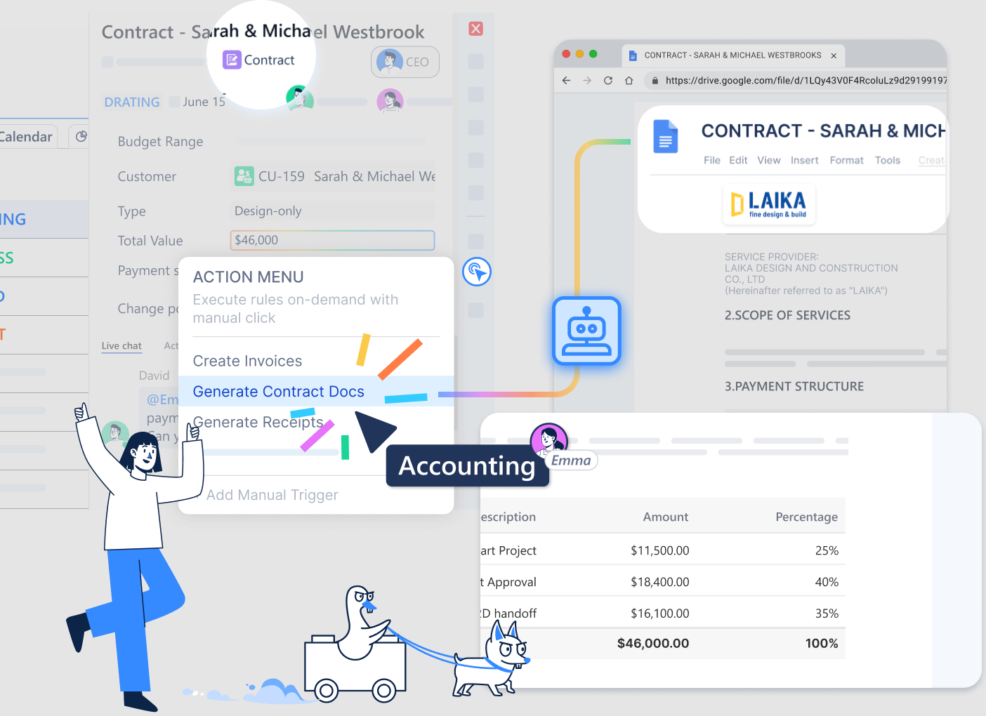 When the Contract is signed, an automation trigger instantly creates a Project Object. The delivery team inherits the scope and deadlines immediately—no handover meeting or email threads required.