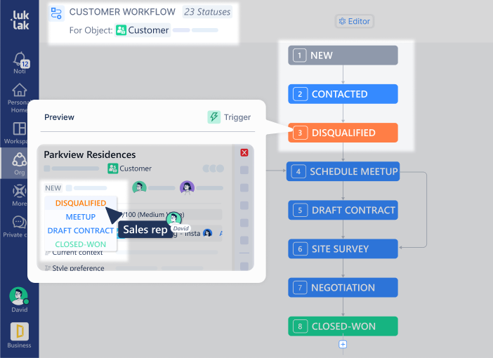 You adapt instantly, without waiting for developers. In traditional software, changing a workflow requires a change request and weeks of coding. In Luklak, if you need to add a “Compliance Check” stage to your pipeline, you simply drag-and-drop the new stage in the Function Design layer. The change is deployed to your team instantly. The software evolves as fast as your business does.