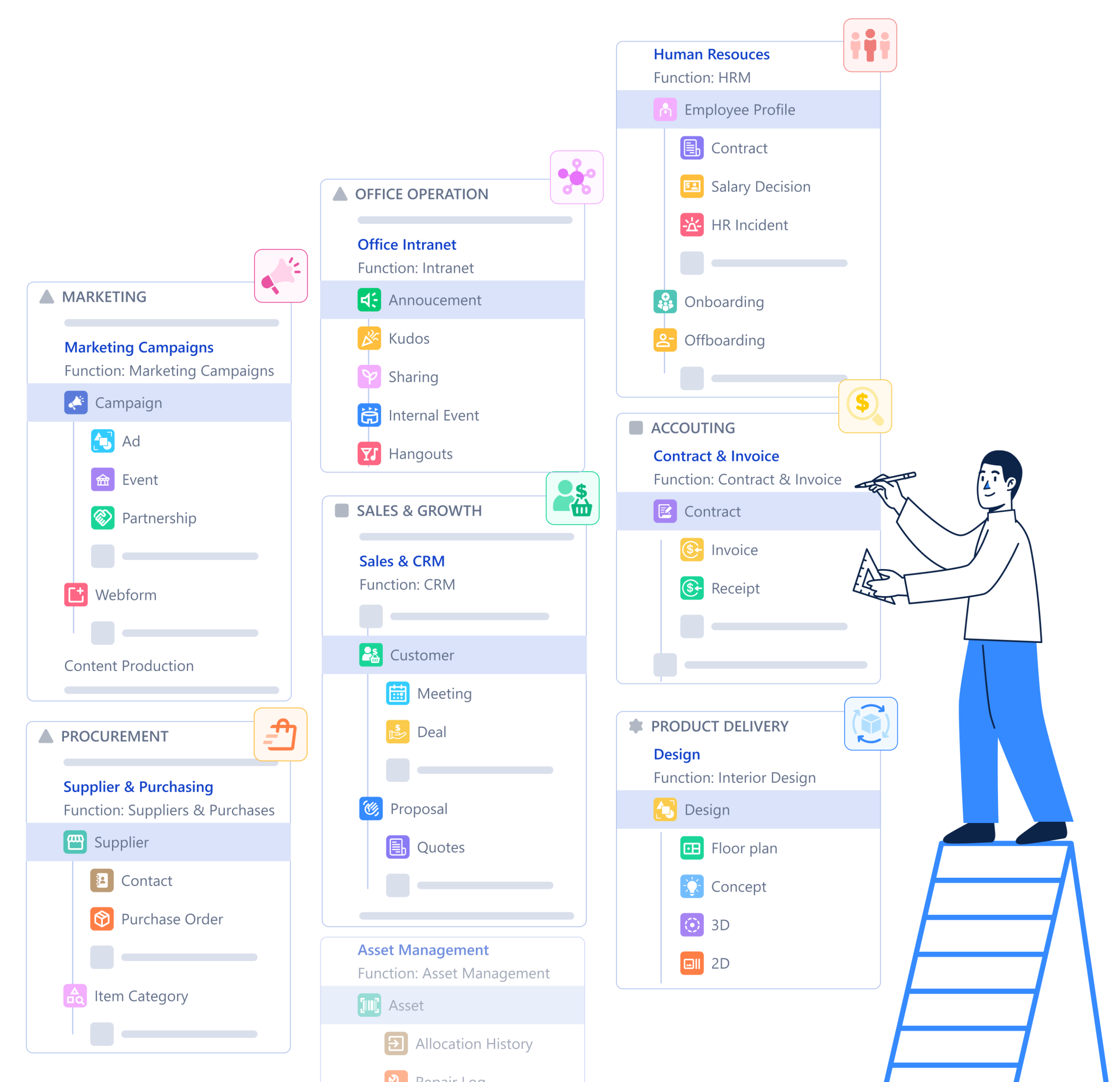 Master nine universal blocks to model any operation—from CRM, HRM to Inventory—on a single unified foundation.