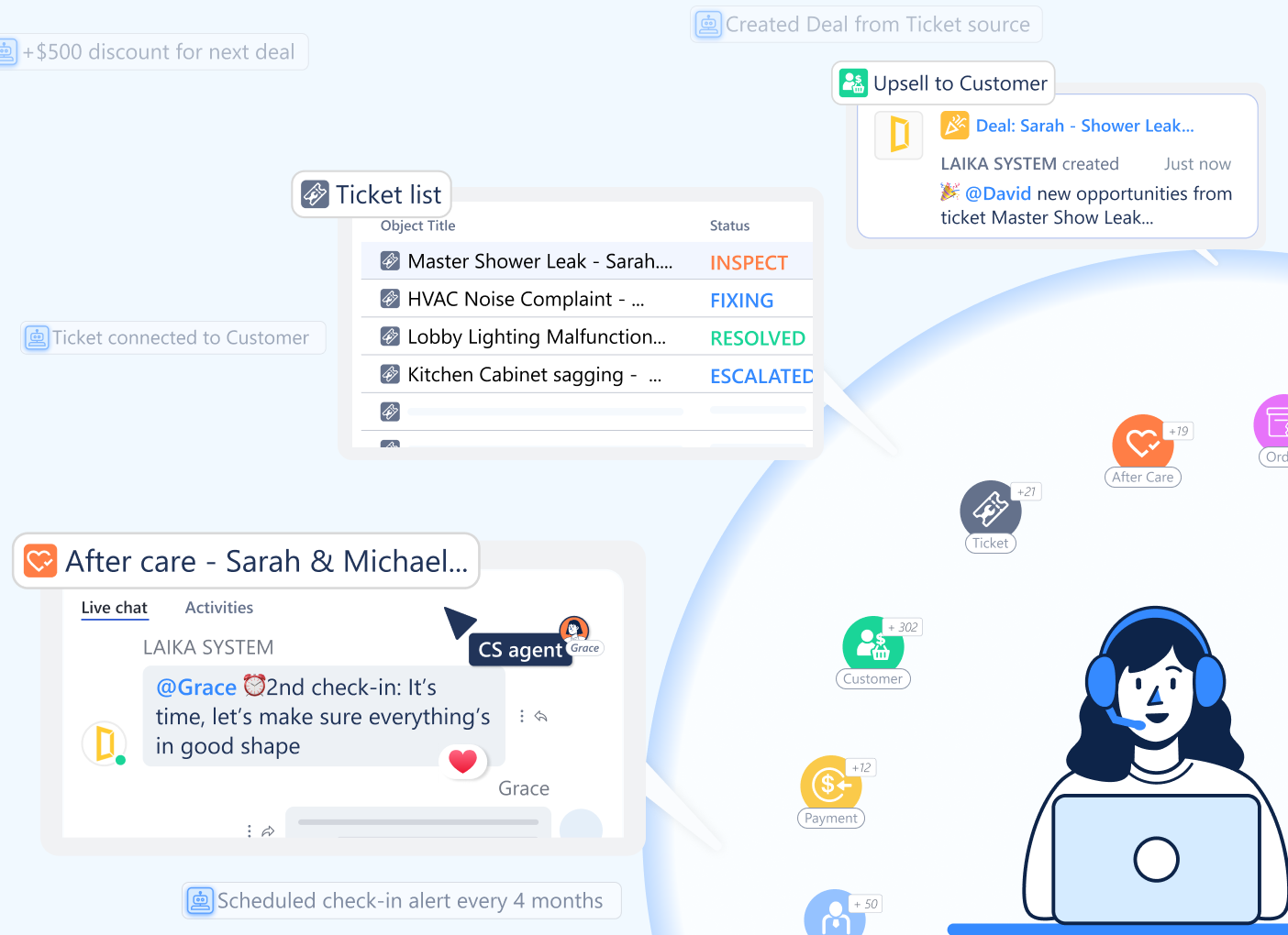 Recurring Care: Automatically schedules an “After-Sales Care” object for 6 months later, prompting the team to check in