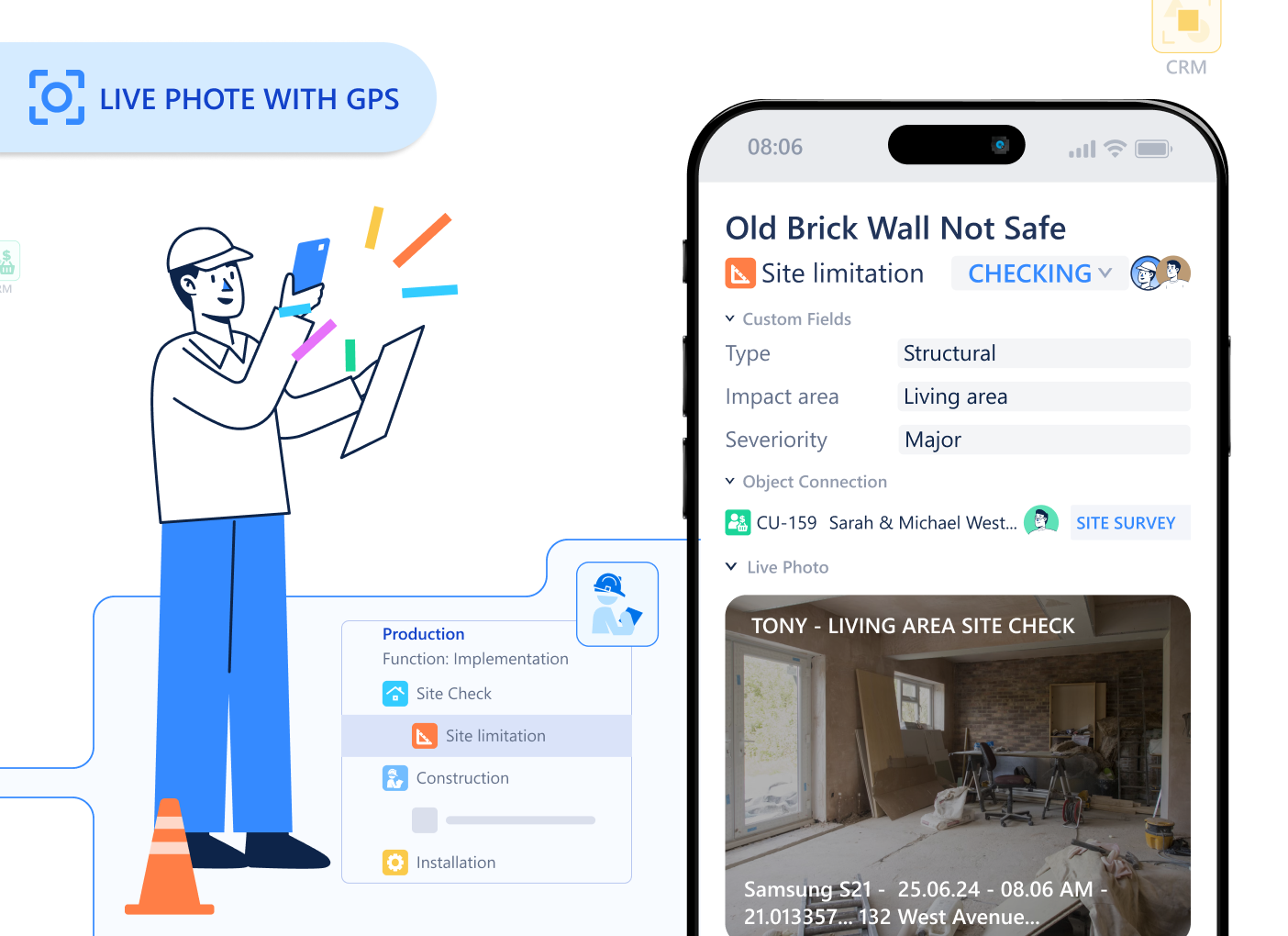 Site Limitation Blocker: A field worker’s QR scan report (e.g., “Old Brick Wall”) blocks the project workflow and alerts the design team instantly