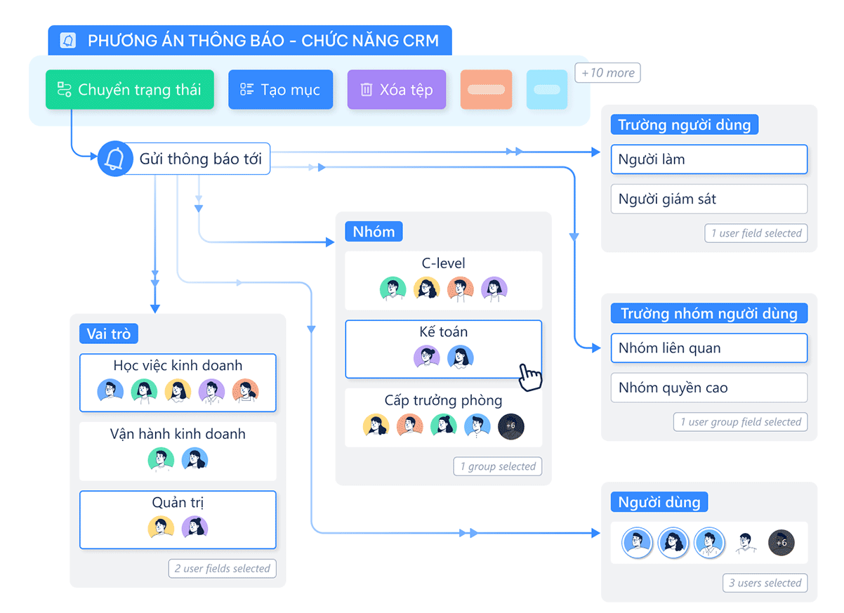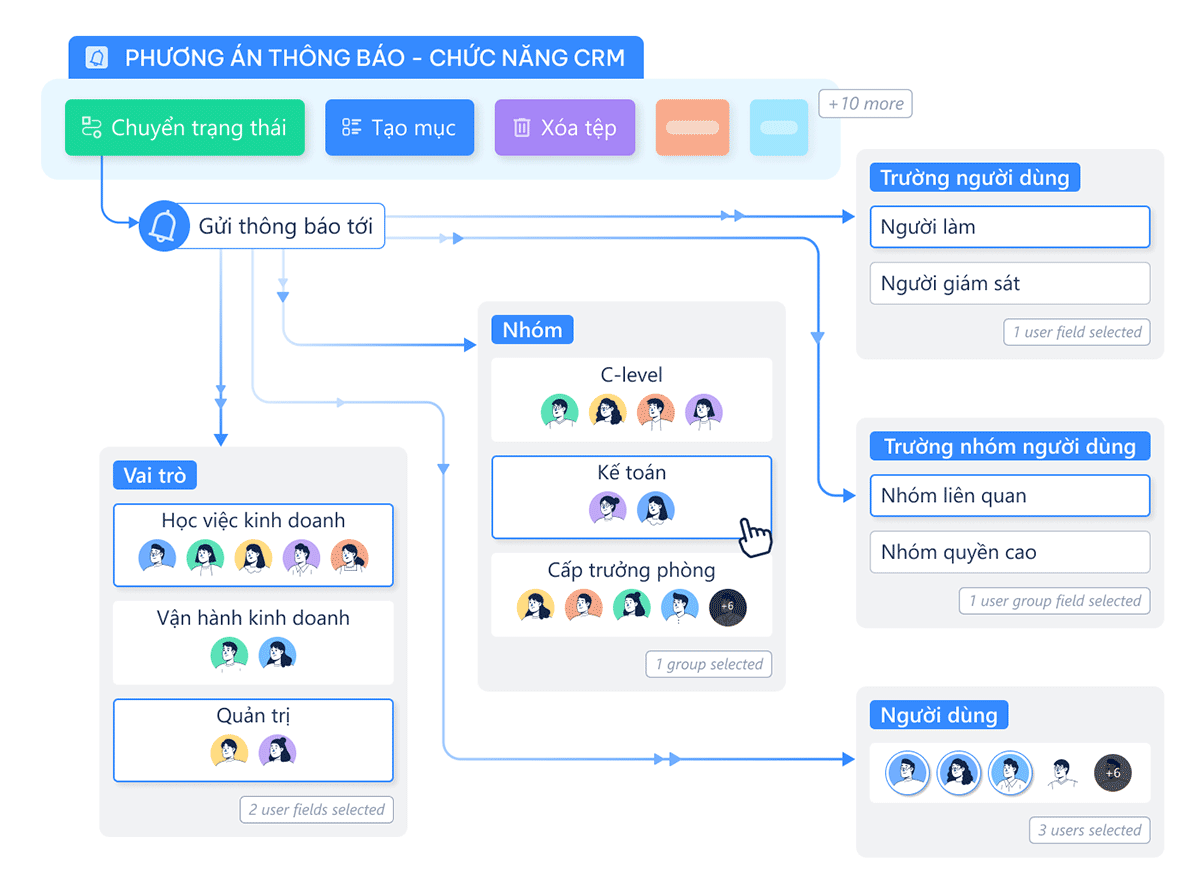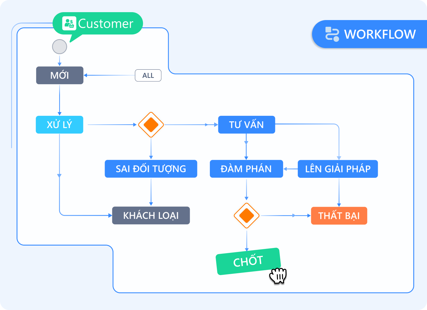 Kéo thả dễ dàng tự định nghĩa các luồng quy trình công việc, bao gồm cả các trạng thái, luồng đi, cài đặt các điều kiện và tự động hóa da dạng linh hoạt. giúp trực quan hóa dễ dàng hướng dẫn nhân sự mới và chuẩn hóa công việc khi đi vào vận hành.