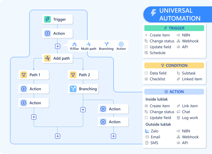 Luklak automation cho phép cấu hình tự động hóa sâu rộng và linh hoạt, kết nối dữ liệu và luồng công việc trên toàn bộ hệ thống, tích hợp với cả các ứng dụng bên ngoài. tự động hóa giúp tăng hiệu suất làm việc, tăng độ chính xác, giảm cảm xúc và sai sót cá nhân.