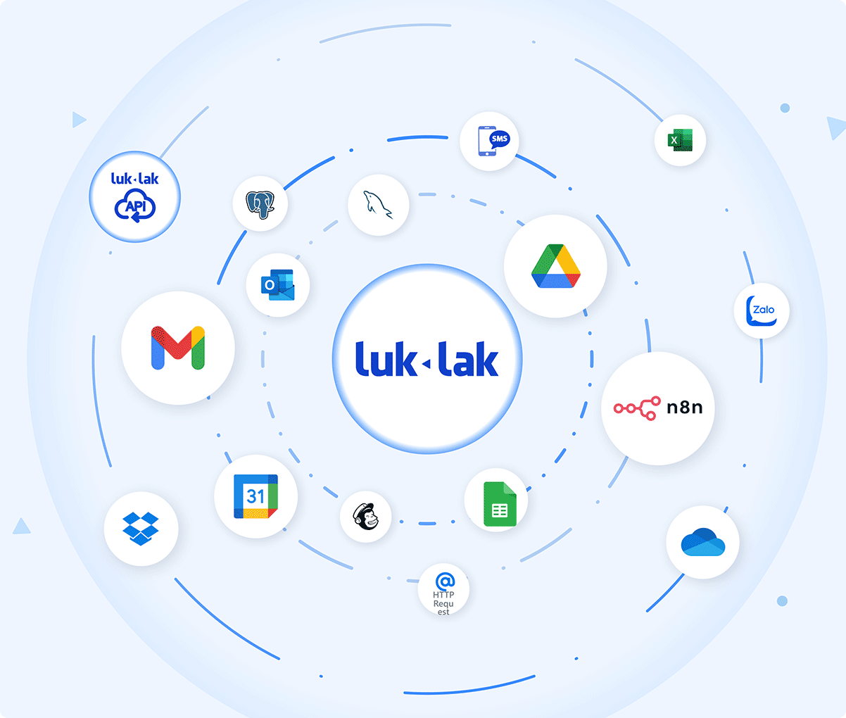 • luklak mở api cho các bên tự làm tích hợp kết nối với các hệ thống đa dạng đang dùng sẵn, đảm bảo luồng công việc không bị gián đoạn.