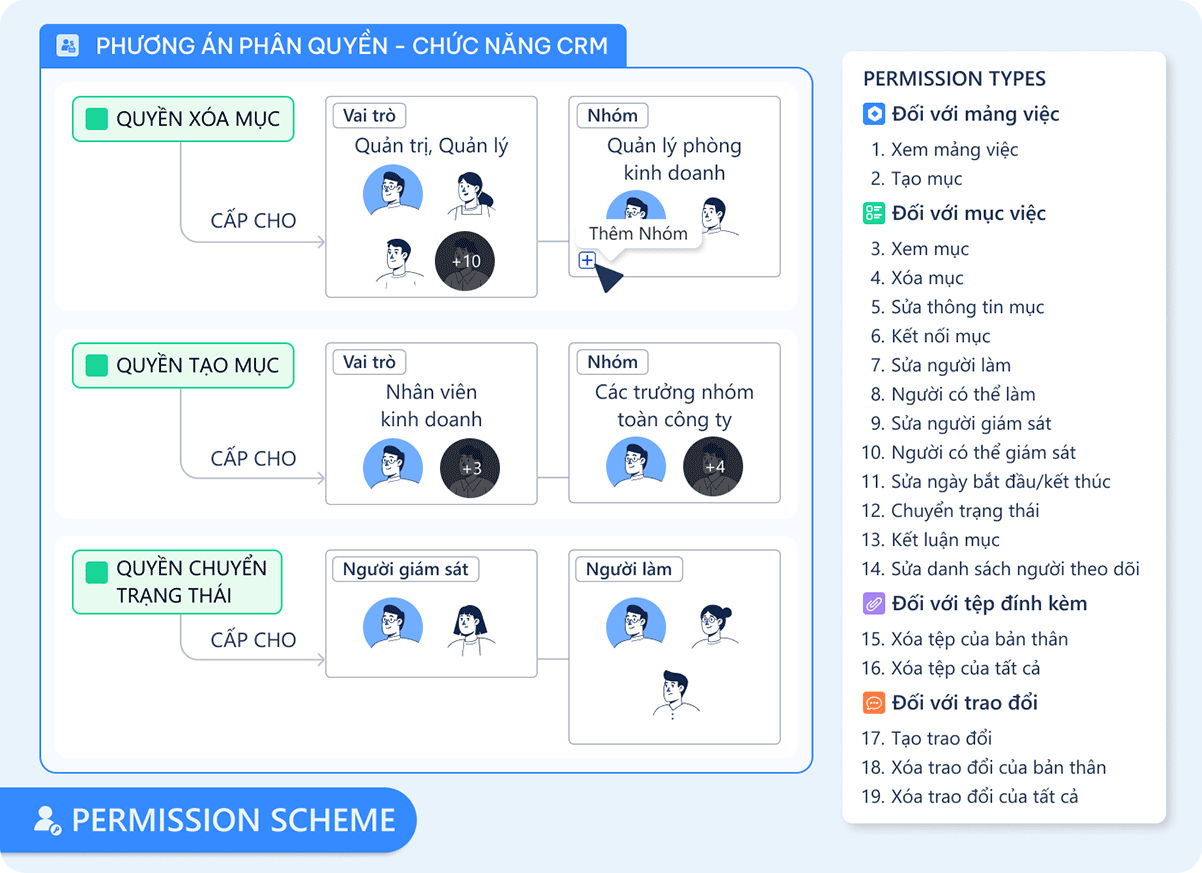 Permission scheme của luklak cho phép định nghĩa phân quyền linh hoạt và chi tiết tới tận chân tơ kẽ tóc: ai, được xem những việc gì, được thực hiện những hành động nào. tương tự, notification scheme cũng cho phép tuỳ biến cài đặt ai sẽ nhân được thông báo về các sự kiện gì diễn ra với công việc. sâu sắc hơn bất cứ hệ thống phân quyền cơ bản nào.