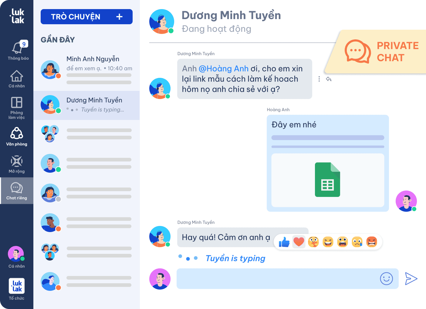 • Giao tiếp đồng bộ & hiệu quả: mệt mỏi khi phải lặn lội giữa nhóm chat & tràng tin nhắn hỗn độn? Luklak hợp nhất dòng chảy chat giao tiếp vào từng đầu việc. Rõ ràng, trọng tâm.