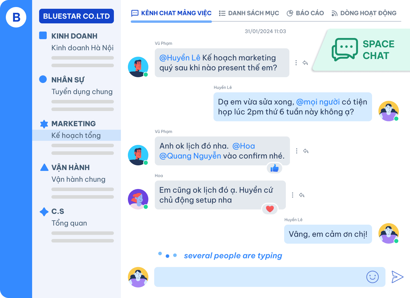 • channel chat: tương đương các app chat doanh nghiệp trả phí như slack, microsoft teams.