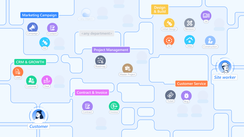 Mỗi Object có thể kết nối linh hoạt với nhau theo quan hệ cha – con, liên kết 2 chiều, hay theo lựa chọn cụ thể qua trường chọn đầu việc, trường dạng bảng tính, tạo nên một hệ thống sống động, mở rộng vô hạn.