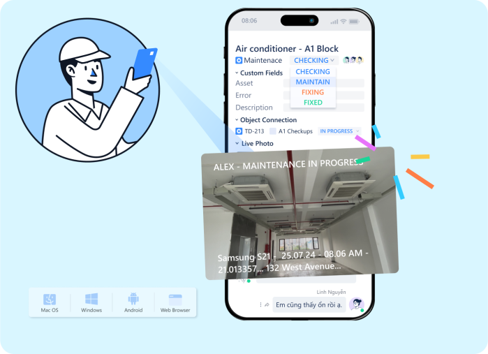 Chụp ảnh trực tiếp từ điện thoại, với đầy đủ thông số thiết bị, địa chỉ, tọa độ vị trí. Ứng dụng để quản lý thông tin check-ins, nhân viên đi thị trường…Tránh gian lận & giảm thiểu sai sót nhập liệu thủ công.