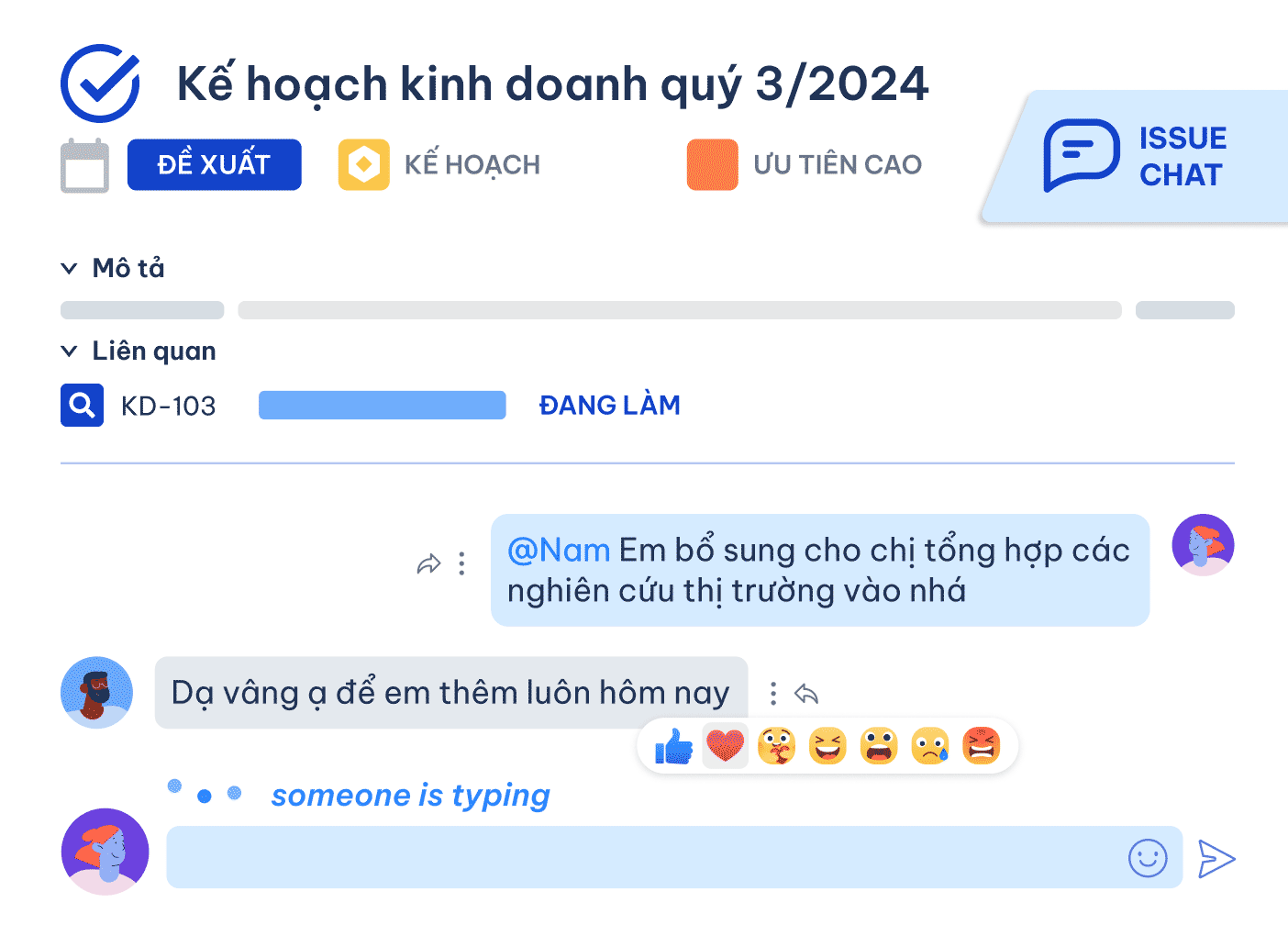 issue chat: chat trực tiếp trên từng đầu việc, từng điểm dữ liệu & tính năng tạo ra từ nocode, cả thế giới chỉ mình luklak có.
