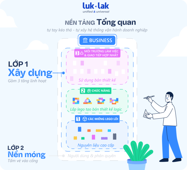 Luklak có kiến trúc độc đáo, cung cấp nền móng và vật liệu; nơi bạn là kiến trúc sư trưởng, kiến tạo nên một “trụ sở số” để quản trị vận hành doanh nghiệp thông suốt mọi phòng ban