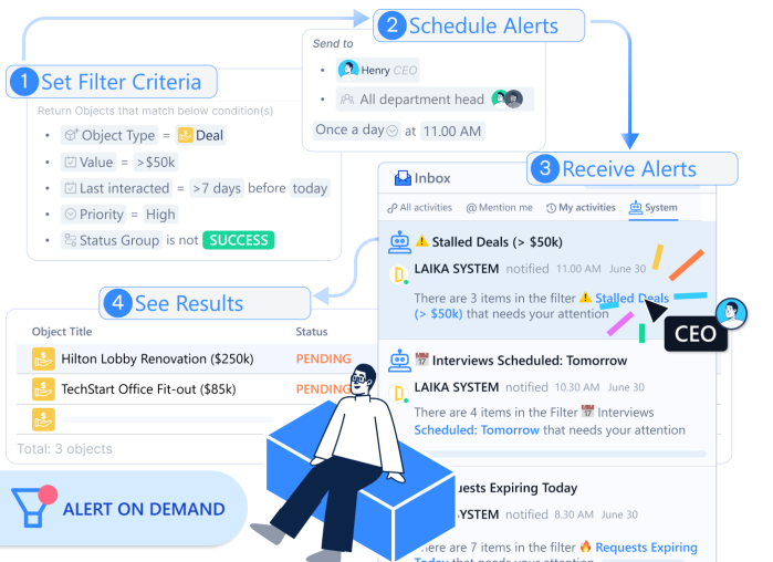 Bộ lọc hoạt động như một màng lọc thông minh — giữ lại dữ liệu thỏa mãn điều kiện và loại bỏ những phần thừa. Thiết lập các tiêu chí như “Ứng viên cần phỏng vấn ngày mai” hay “Hợp đồng đến hạn hôm nay”, rồi đăng ký nhận báo cáo. Hệ thống sẽ tự động gửi danh sách đã tinh lọc — mỗi sáng sớm hoặc định kỳ vài giờ một lần — để bạn luôn biết điểm nóng của ngày hôm nay nằm ở đâu.