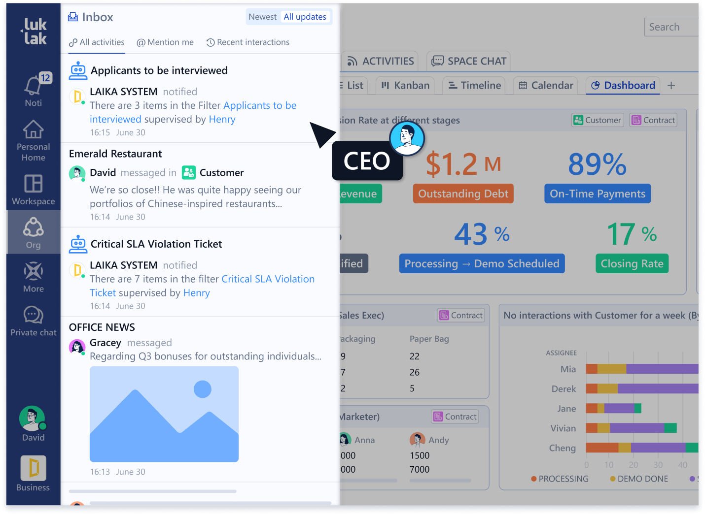 Chẳng cần đợi cuối tháng mới có báo cáo. Luklak để lãnh đạo cảm được nhịp thở doanh nghiệp ngay lúc nó đang đập — qua Hộp tin hợp nhất, và các dữ kiện được gắn chặt vào ngữ cảnh.