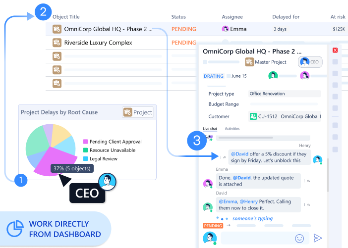Đừng chỉ nhìn vào những chỉ số báo động đỏ — hãy sửa chúng. Bấm vào một phần biểu đồ để mở ra các bản ghi chi tiết ẩn phía sau. Thấy một thương vụ đang đình trệ? Mở ra và nhắn team gỡ rối ngay lập tức. Mọi thao tác diễn ra không cần rời khỏi dashboard.
