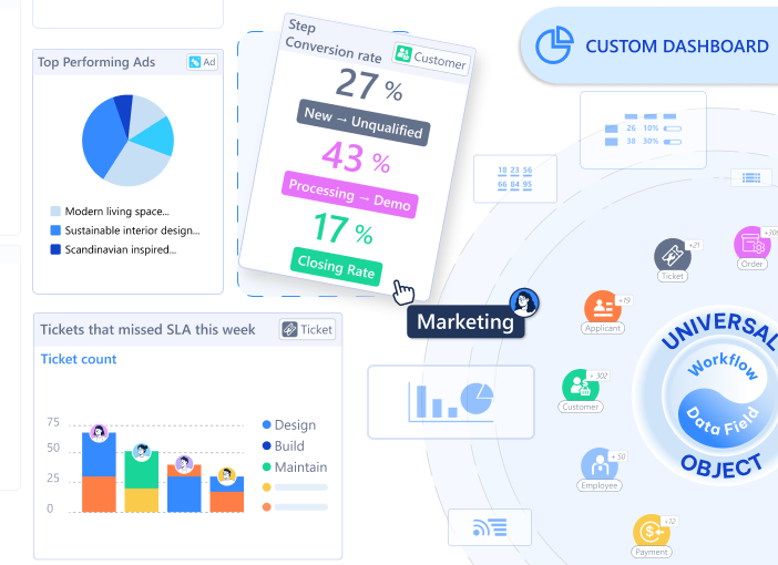 Bạn không cần nhờ đến Data Analyst hay viết câu lệnh SQL. Chỉ cần kéo thả là tạo được mọi kiểu báo cáo trực quan, nắm ngay mọi chỉ số — từ lượng deal đang chạy bên Sales đến sự cố an toàn ngoài công trường — chỉ trong vài giây.