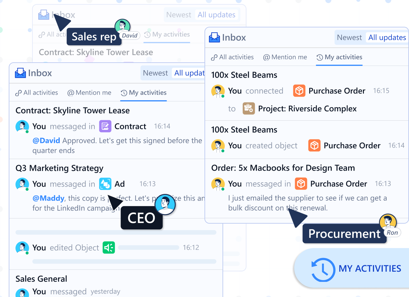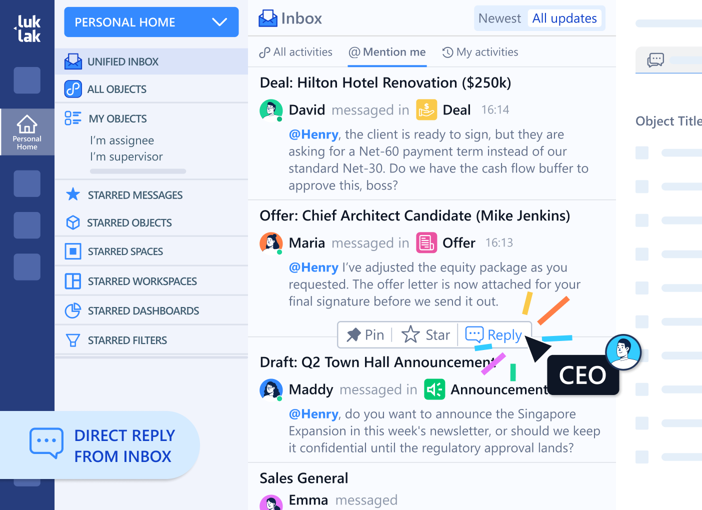 Đừng chỉ xem — hãy hành động. Trả lời tin nhắn ngay trong hộp thư. Gỡ vướng mắc ngay khi nó xuất hiện mà không làm gián đoạn mạch làm việc hiện tại.